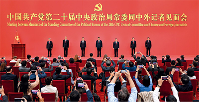 2022年10月23日,刚刚在中国共产党第二十届中央委员会第一次全体会议上当选的中共中央总书记习近平和