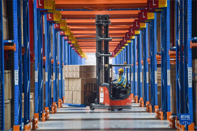 在位于江苏省南京市江宁区的苏宁华东物流中心,工人驾驶叉车搬运商品(2022年11月10日摄)。