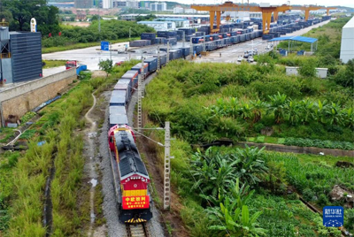 搭载2600吨白糖的中欧班列从南宁国际铁路港出发驶向哈萨克斯坦阿拉木图(2022年5月15日摄,无人机照片)。